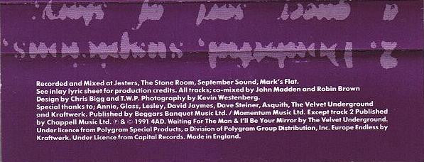 Recorded and mixed at Jesters, The Stone Room, September Sound, Mark's flat. [Samples: <i>Waiting For The Man</i> & <i>I'll Be Your Mirror</i> by The Velvet Underground [A1 <i>Europe Endless</i> by Kraftwerk [B3